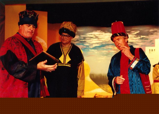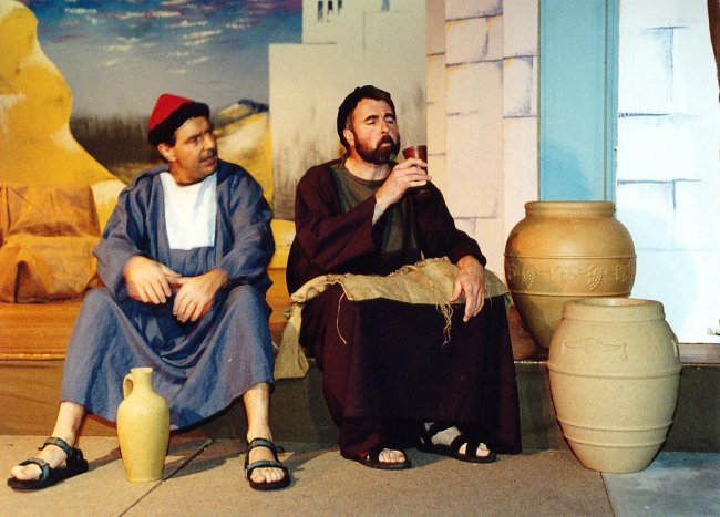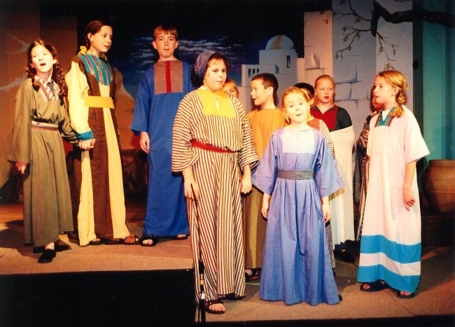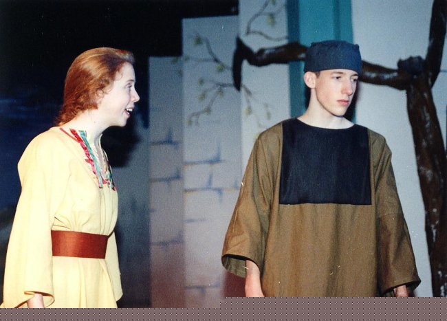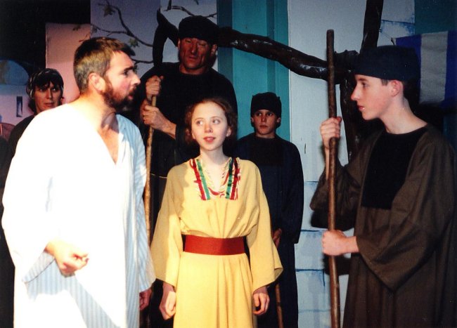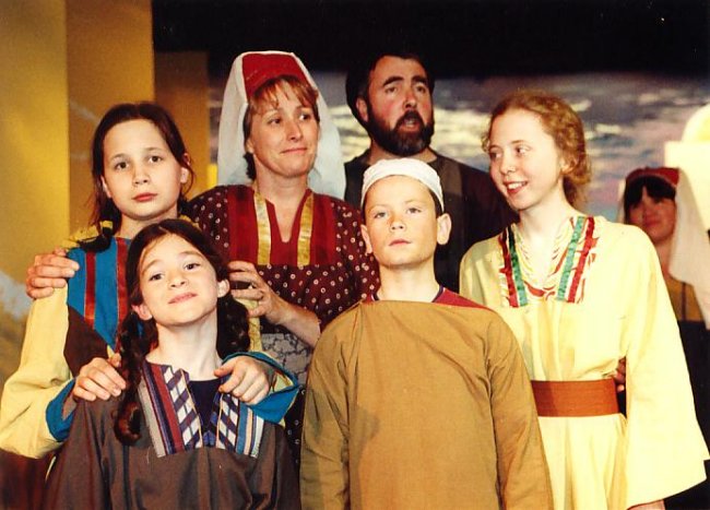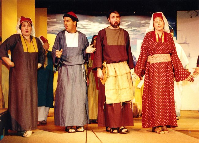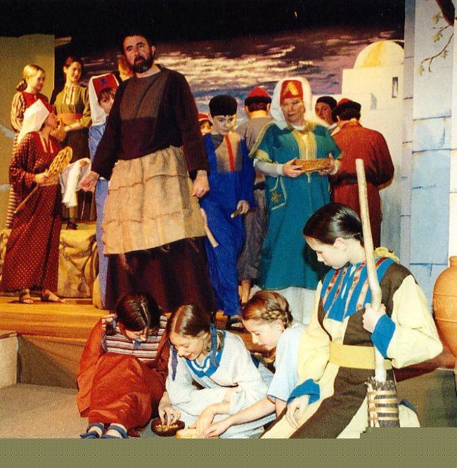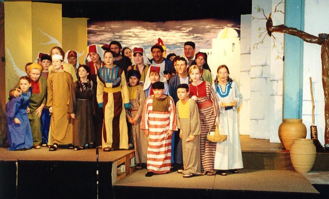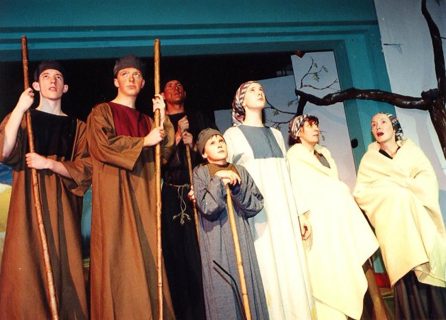 Book by Alison Faulkner This was the first time that SMASH has chosen to repeat a work but it seemed important to celebrate the year 2000 with a Christian work. For many people, Christmas may simply be a festival to brighten the cold, dull days of winter. Others may be looking for something to give their lives more meaning, and the celebration of the birth of Jesus is just that. This is one of the messages of Born For Us All. 2000 years ago, the people of Bethlehem needed hope. They lived in an occupied country where the Romans were controlling their lives. They may have longed for a Messiah to come and bring them hope for the future. Perhaps today we can still see the relevance of Christ's message for us. We may not be like the shepherds, visited by voices from God. We may not have anything as clear as a shining star to guide our way. We may be like Jacob who gradually comes to see that Jesus' birth has some meaning for him. Alison Faulkner The situation in which the people of Palestine found themselves two thousand years ago, holds many parallels for people today. The country had been invaded and was ruled by foreigners, there was a feeling that individuals had no power to shape events, and that whatever happened was governed by fate. Into this dark world came one baby, giving hope for the future, who later suggested that individuals mattered and had free will. In revising the music for the production, it became clear that we should add some songs which explored how the situation affected the thoughts and actions of ordinary people. So those who saw the original production will find some new emphases and new music -but don't worry, 'Counting Sheep' is still there. Peter Farndon The synopsis of the story is detailed in the entry for the first time the musical was performed (1992). The script, score and a video are available. Photographs - please click on a photograph for a larger image Text and photographs © SMASH 2004 |