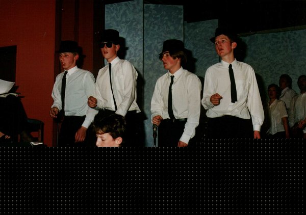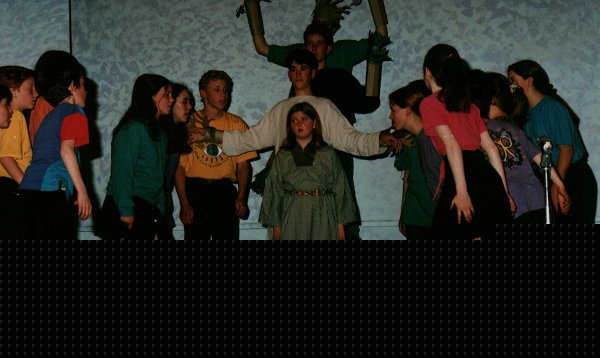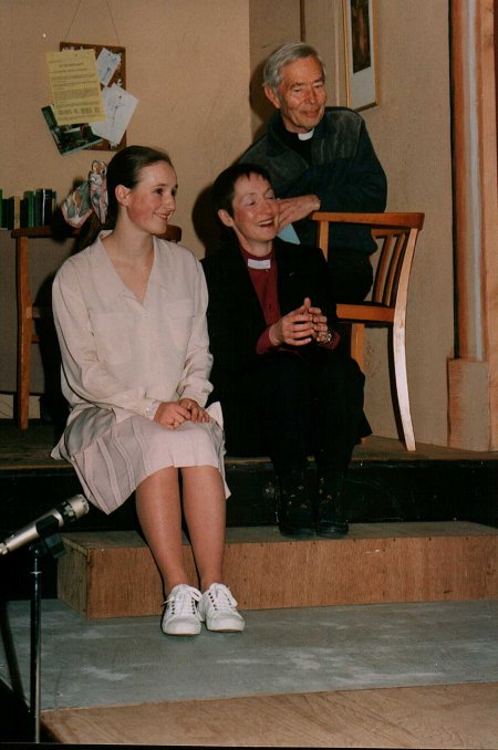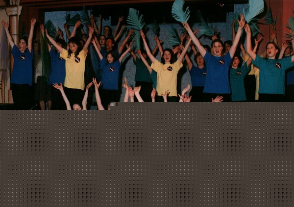 "A transforming experience. We wanted to do two related things: to celebrate the life God offers, and to challenge all that prevents people from benefiting from it: greed, fear, prejudice or just plain apathy. It would be a single song about a carpenter who loved life, and wanted to free people from all that prevented their enjoyment of it. Like Topsy, the idea "just growed". We called it a "musical" because "cantata" would have been too dignified a description, and yet we wanted it to be accessible to churches and groups with fairly small resources. So we used narrators, rather than dramatic dialogue, while leaving open the possibility of the addition of simple drama, dance and mime. During its first year of publication, many performances of varying complexity were staged, showing that the work was indeed flexible and effective. Then along came SMASH with a challenging question. Could the piece actually be written as a full-scale fully staged musical? The most obvious difficulty was that the lyrics link the time of Christ with contemporary issues and ideas: how was that to be achieved in a stage play? The "play within a play" format seemed an attractive possibility, and the work commenced. The telephone and fax lines between Solihull, Leicester and Glenalmond glowed in the night sky as ideas were exchanged, rejected, refined, aborted, resurrected and finally knocked into shape. The result of all that, here performed for the first time, is not simply a "life of Christ", but an exploration of the effect that life has on those of present day people who dare to take it seriously – but not that seriously. Michael Forster Christopher Tambling This production welcomed 17 newcomers to SMASH. Proceeds for the Church Development fund and to help fund the nursing training of a Kenyan who received support from Solihull Methodist Church for her education. Photographs (please click on a photograph to see a larger image)