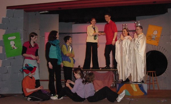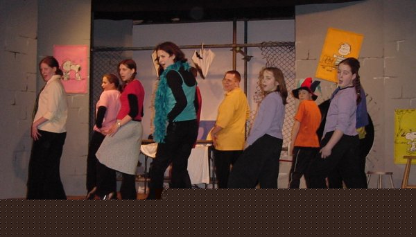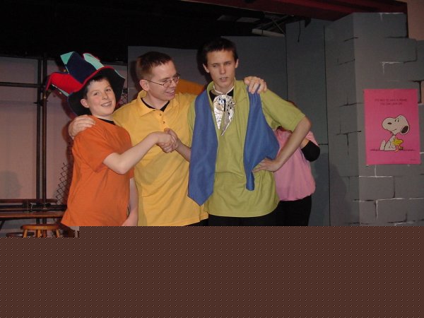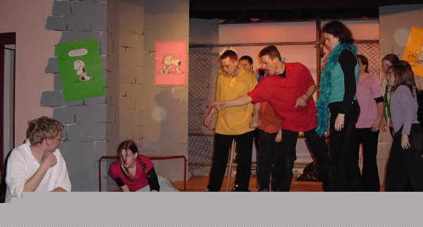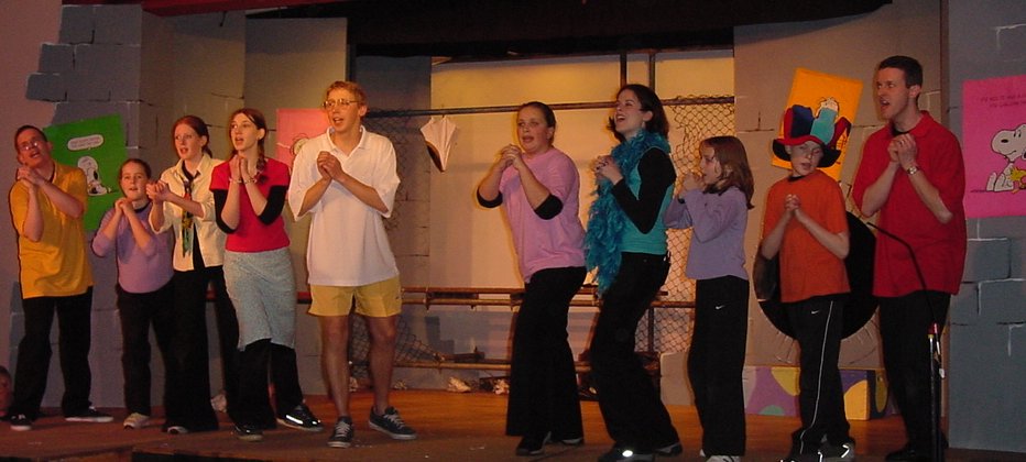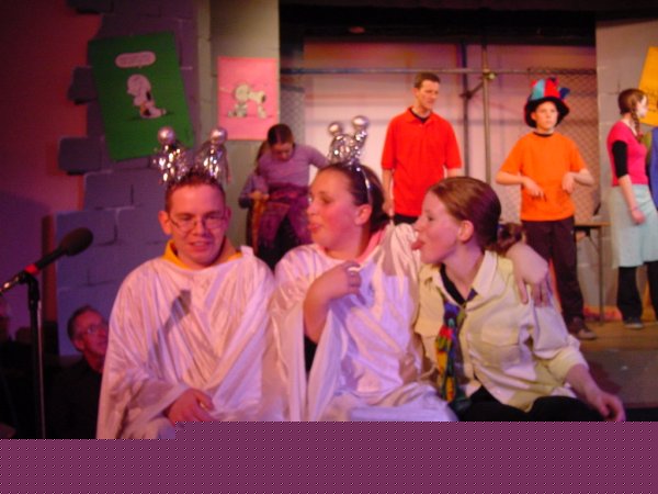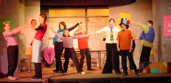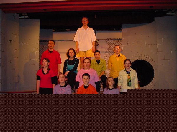 one of your brothers here, you did not do for me'. It is a story we all clearly still need to hear." Review from Solihull Messenger April 2002GodspellThe younger members of Solihull Methodists Acting and Singing in Harmony last night proved that the group has a bright future ahead, with a ground-breaking new production of Stephen Schwarz’s Godspell. Kirsteen Farndon, directing her first production for the group, infused the 30 year old script with an energy and topicality that was established from the opening sequence. The connection between the Biblical stories upon which the musical is based and the problems of modern life was emphasised through a montage of media clips, the design of the set, and a mobile phone conversation that provoked a few ‘tut’s from audience members before they realised it was part of the show! The cast buzzed with energy and established a community dynamic which heightened the poignancy of the final scenes. Richard Bates gave Jesus an affable quality in the first half, and was powerfully moving during the growth in tension in the second act. The cast all demonstrated a musicality that complemented the innovative underscoring of musical director Peter Farndon, and the singing was enhanced by the off-stage chorus, made up of members of SMASH of all ages. Choreography in a variety of styles punctuated the familiar parables, and the audience responded well to the physical humour that shone through in the different scenes. It is notoriously difficult to please a first night audience, so the cheers at the end of last night’s performance are a tribute to the efforts and achievement of this sparkling cast and crew. LB Photographs (click on a photograph for a larger image) Text and photographs © SMASH 2004 |